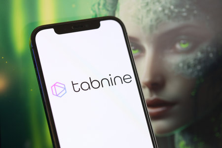 KYIV, UKRAINE - MARCH 17, 2024 Tabnine logo on iPhone display screen with background of artificial intelligence futuristic ai generated image close up