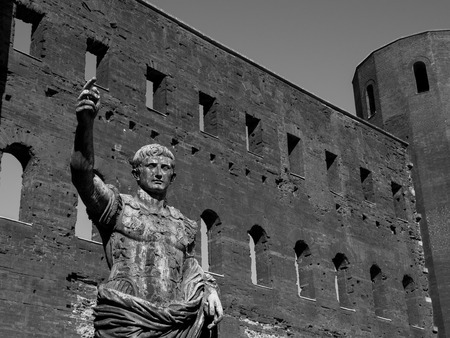 Caesar Augustus, first emperor of Ancient Rome. Old bronze statue in the Imperial Forum (Black and White with copy space)