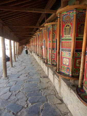 Prayer wheel in Tibetan Buddhist monastery Arou Da Temple in Qinghai China.