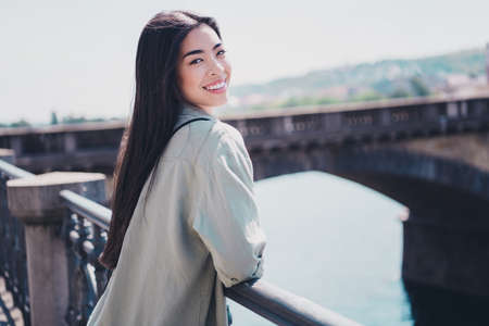 Portrait of sweet lovely lady enjoying city center walk excursion look stand on bridge outdoors