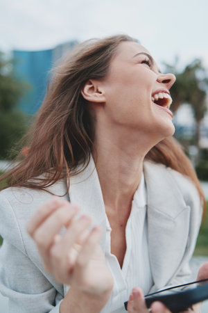 Happy woman with light brown hair laughing outdoors in casual business attire during daytime city background