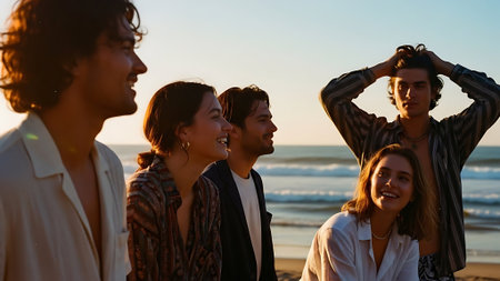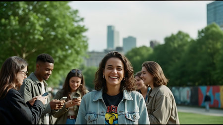 A vibrant group of diverse young adults shares laughter in an urban setting.