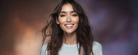 A young woman with flowing brown hair smiles warmly while wearing a simple gray shirt. She stands confidently against a softly blurred colorful background radiating positivity and joy.