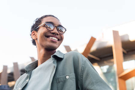 low angle view of happy african american man in eyeglasses looking away outdoors