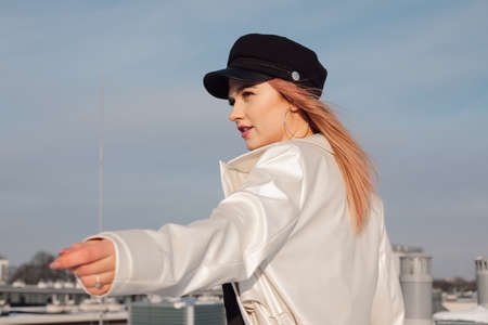 Girl against blue spring sky in light raincoat and cap on her head stretches out her hand in anticipation. Red-haired young beautiful woman looking to side. Close-up portrait