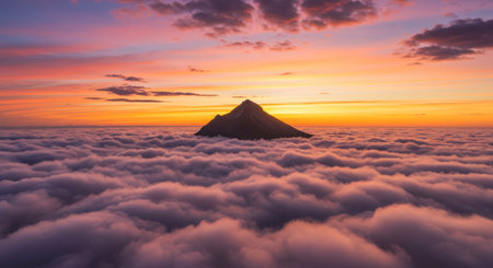 Mountain summit piercing through a thick blanket of clouds at sunset. Vibrant orange and pink sky over a vast cloudscape. Ethereal landscape view.