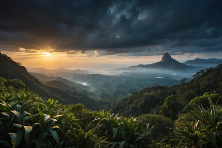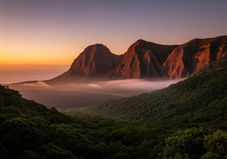 Rugged mountain range bathed in warm golden hour light, rising above a dense, dark green jungle canopy. low lying mist fills the valley floor, creating a dramatic and serene natural landscape view.