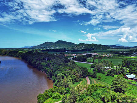 Aerial view of land river and mountain backdrop