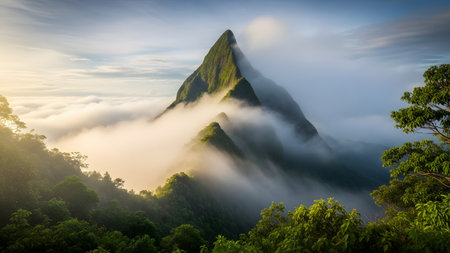 A towering mountain rises above dense green forests shrouded in mist and clouds during early morning hours.