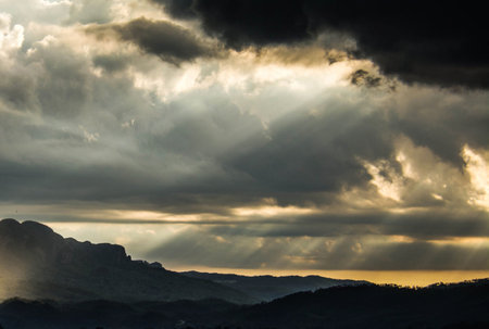 Phou Khoun Dramatic sky. sun ray shining over mountain. View point on laos luang prabang sky road.