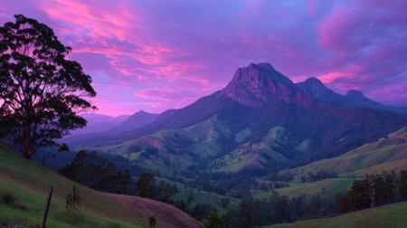 Breathtaking view of a majestic mountain landscape at dusk, showcasing vibrant purple and pink skies above lush green hills, creating a serene outdoor scene.