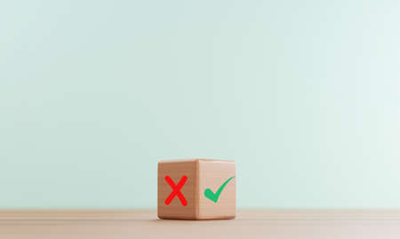wooden cube with correct sign icon. Right sign concept. certified and correct mark. Standard certification, accurate selection, production standards and good quality. An ethical co