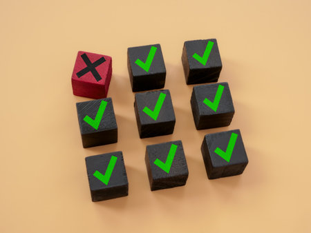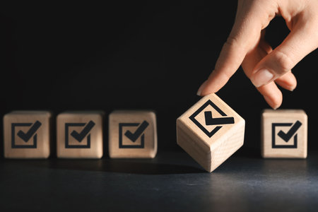 Wooden blocks with checkmark symbols on a light blue background representing success, approval, validation, and positive outcomes in various contexts