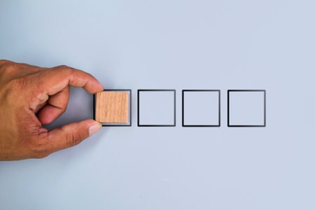 The image features a hand interacting with a series of wooden blocks, each marked with a checkmark. The blocks are arranged in a row on a white background, and the image has a transparent background. This visual emphasizes the concept of approval or completion.
