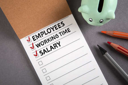 Payroll concept. Salary, employees and working time. Notebook on gray office desk