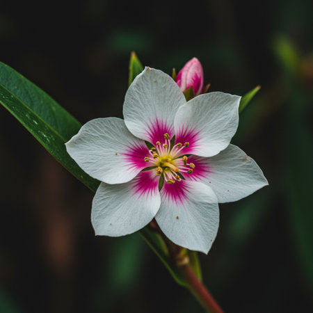 Close up of a white flower with pink petals on dark background