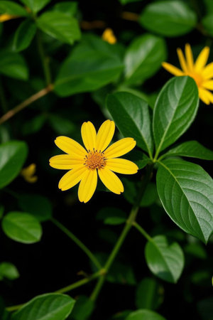 A vibrant yellow flower blooms amidst lush green foliage, showcasing the beauty of nature. This close-up highlights intricate petals and lively colors, perfect for various design projects.