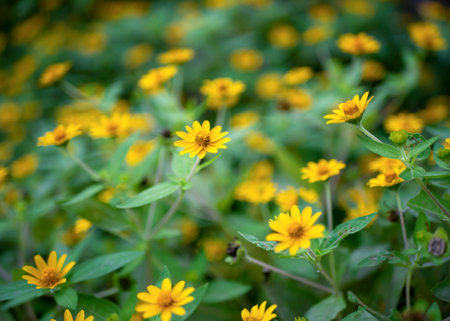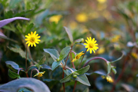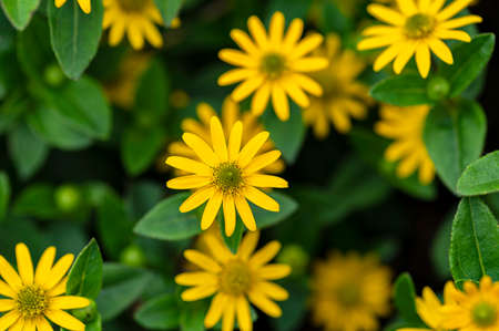 Melampodium Butter Daisy, mini sun flower, yellow flower Rudbeckia, Heliopsis helianthoides, blooming toward the sky, in shallow focus