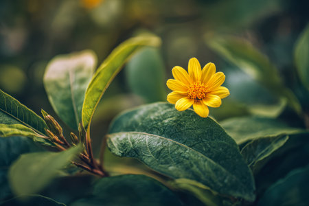 A radiant yellow blossom emerges amidst dense emerald foliage, capturing the understated elegance and tranquility found in nature's quiet sanctuary.