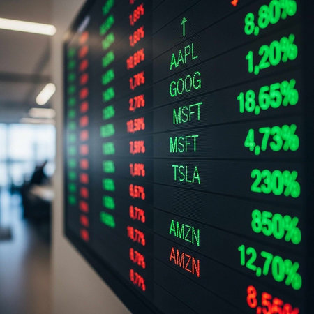 A stock market display board showing various company stock prices and percentages in a modern office setting