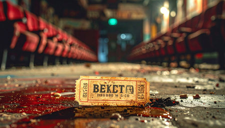 A single, vintage ticket lies on the grimy, blood-stained floor of an empty theater. The show is over, but a dark mystery remains.