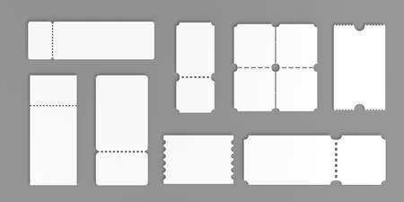 3D Set of blank tickets, discount vouchers or gift coupons with ruffle edges. Realistic mockup empty white tickets to movie theater, concert, circus or festival, isolated on grey background, 3D render