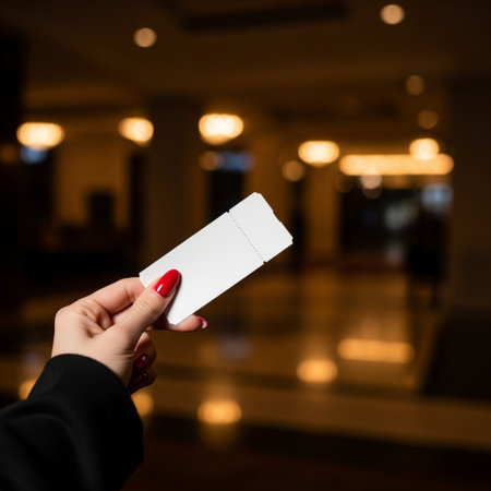 Hand holding a paper ticket on blurred background (movie cinema concept concept)