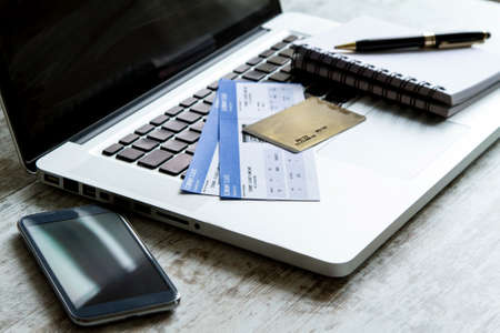 Laptop, plane tickets, coffee, cappuccino and credit card lies on the table. The view from the top. The concept of travel and transport