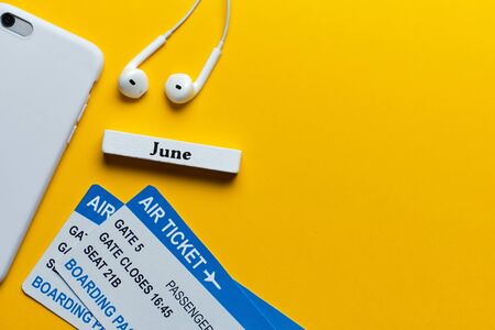 June vacation concept - plane tickets with telephone and headphones on a yellow background with copy space