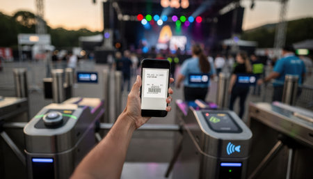 Medium shot capturing the moment a fan waves a smartphone near a contactless reader at a concert entry with background visitors and gates gently blurred