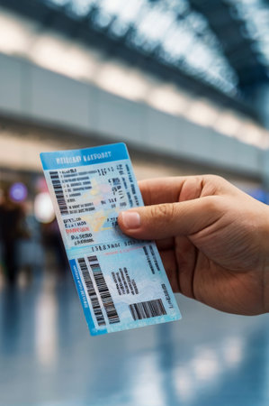 In a bustling environment, two hands are engaged in a transaction, exchanging tickets adorned with barcodes. The scene captures a moment of anticipation and excitement, highlighting the connection between individuals as they prepare for an upcoming event or journey.