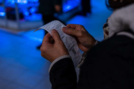 Young man's hand holding a paper ticket on blurred background (booking ticket concept)