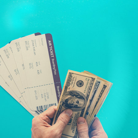 Hands with a ticket and passport. Ready for flight in airport and checkout. Travel and vocation vertical concept