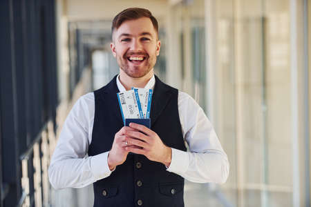 Young male passenger in elegant formal clothes smiling and holding tickets in hands in the airport hall.
