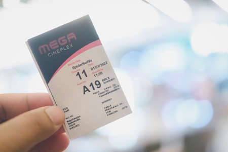 Samut Prakan, Thailand - January 1, 2022 : A hand holding of movie ticket is Spider-man No Way Home, Cinema in Mega Cineplex, Mega Bangna Mall
