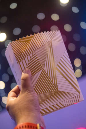 Bangkok, Samut Prakan - June 4, 2022 : hand holding Popcorn in paper bucket from brand of movie theater in Thailand Major Cineplex, customers buying before going to watch movie