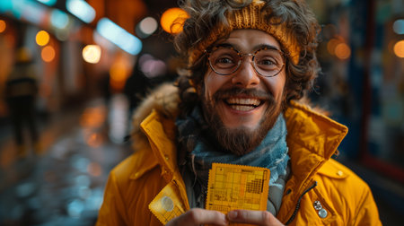 Smiling Man Holding a Yellow Ticket at Night in the City