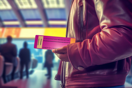 In a bustling environment, two hands are engaged in a transaction, exchanging tickets adorned with barcodes. The scene captures a moment of anticipation and excitement, highlighting the connection between individuals as they prepare for an upcoming event or journey.