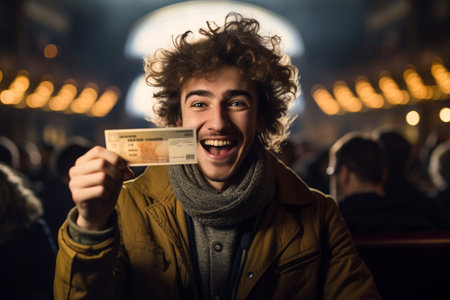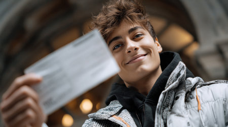 A young man is holding a piece of paper with a smile on his face. The paper appears to be a ticket or a receipt, and the man seems to be happy about it. Concept of joy and satisfaction
