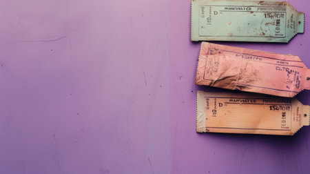 Three crumpled movie tickets on a purple surface.