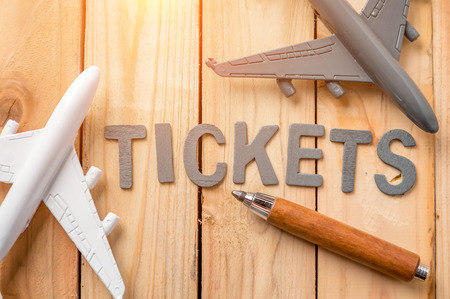 Airline tickets word and toy airplane on wooden background