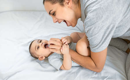Happy mother having fun with her little baby on bed - Family and Maternity concept