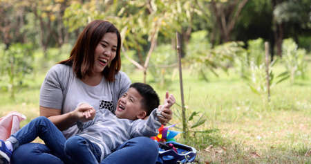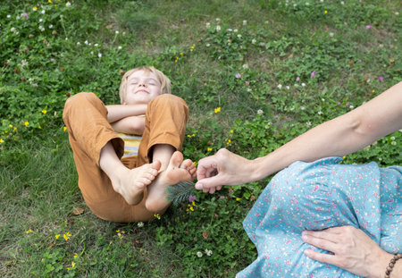 concept of a friendly cheerful family, mom plays with her son lying on the grass, gently tickling his bare feet. People have fun in the summer park. positive thinking, good mood and healthy lifestyle