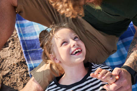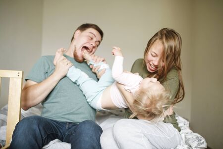 Young family playing and having fun. Loving happy mom and dad tickling her little daughter and laughing while resting together in bed
