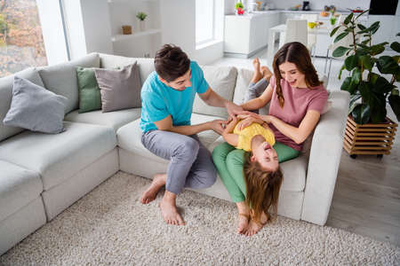 Top above high angle view photo of three people family mom dad sit couch play small daughter tickle she laugh in house indoors