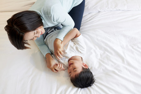 Top view of cute little boy and his asian parents looking at camera and smiling while lying on the white bed at home, Happy Family concept