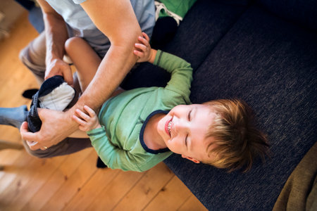 Upper view portrait of a balding caucasian father who is playing on the sofa with his small smiling son