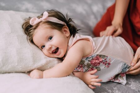 Little cheerful baby girl is lying on the bed while her mother is dressing her.
