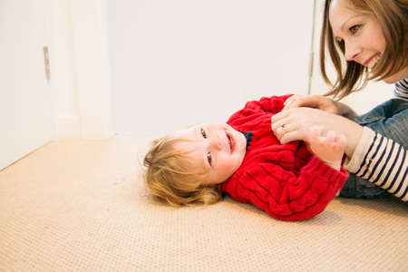 Father trying to put clothes on his toddler son, laughing. Hard work.