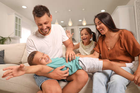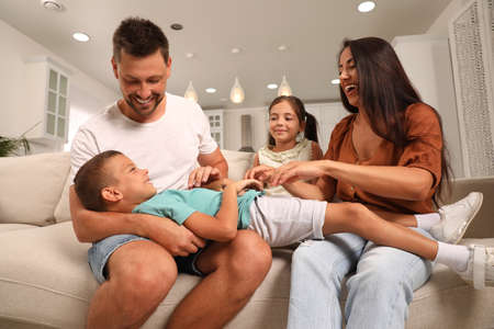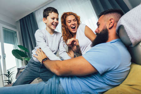 Beautiful happy family having fun at home - parents playing with their son on sofa